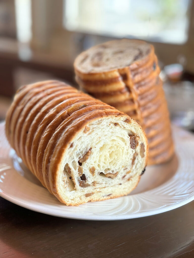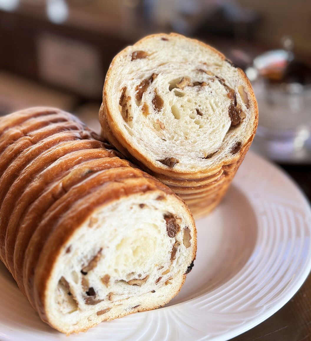 ラム酒で漬けたレーズンをたっぷり巻き込み、アクセントにクルミを入れた新作ラウンドパンの登場です‼🍇